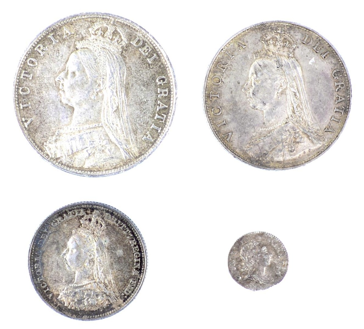 Silver Halfcrown, Victoria, 1887; Florin, 1887; Shilling, 1887, small head; Penny, George III, 1780, young bust (S 3924; 3925; 3926; 3759). Shilling very fine, others nearly extremely fine. [4]