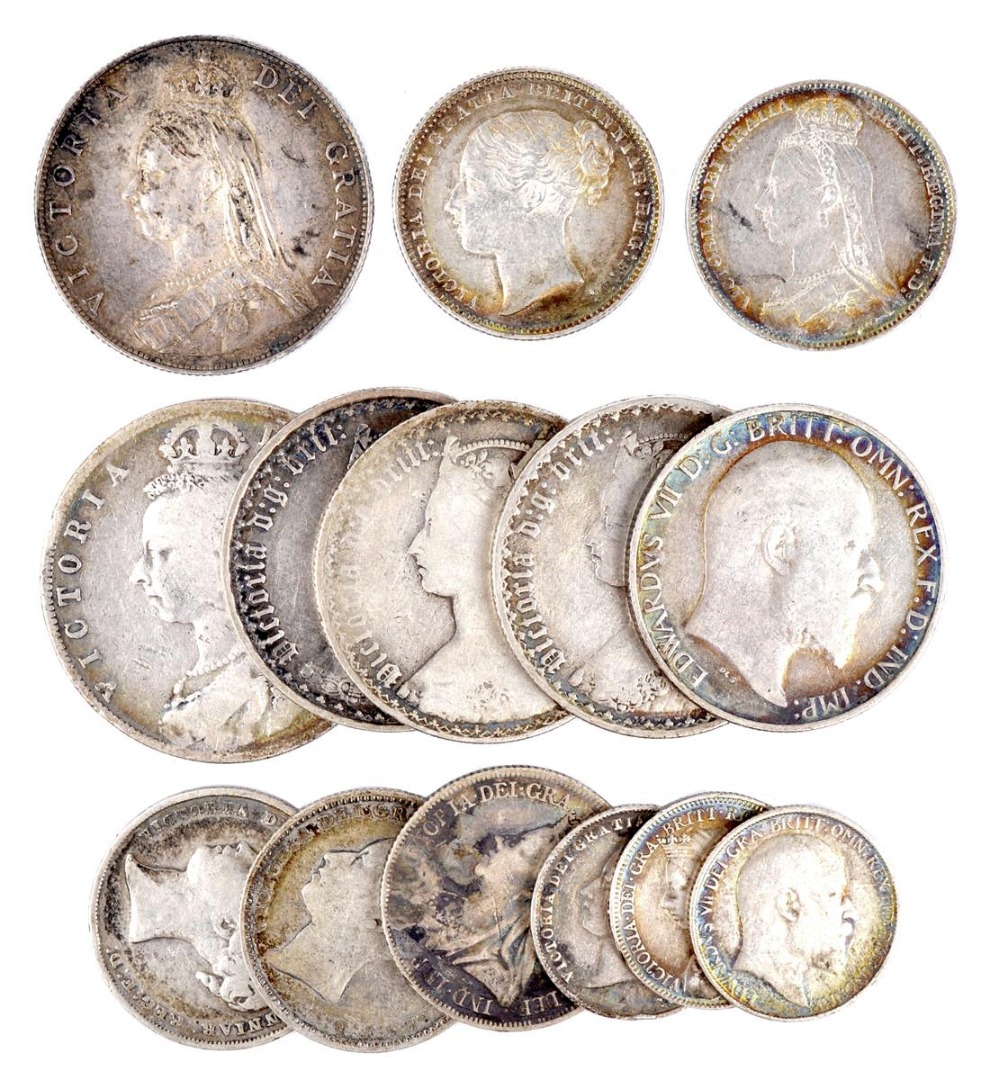Florin, 1887, nearly extremely fine; shillings (2), 1875 (die 13), 1890, good very fine or better; together with: Halfcrown, 1889; Florins (4), 1862, 1865, 1887, 1903; Shillings (3), 1853, 1880, 1900; Sixpences (3), 1866 (die 32), 1897, 1909. All fine or nearly so [14]