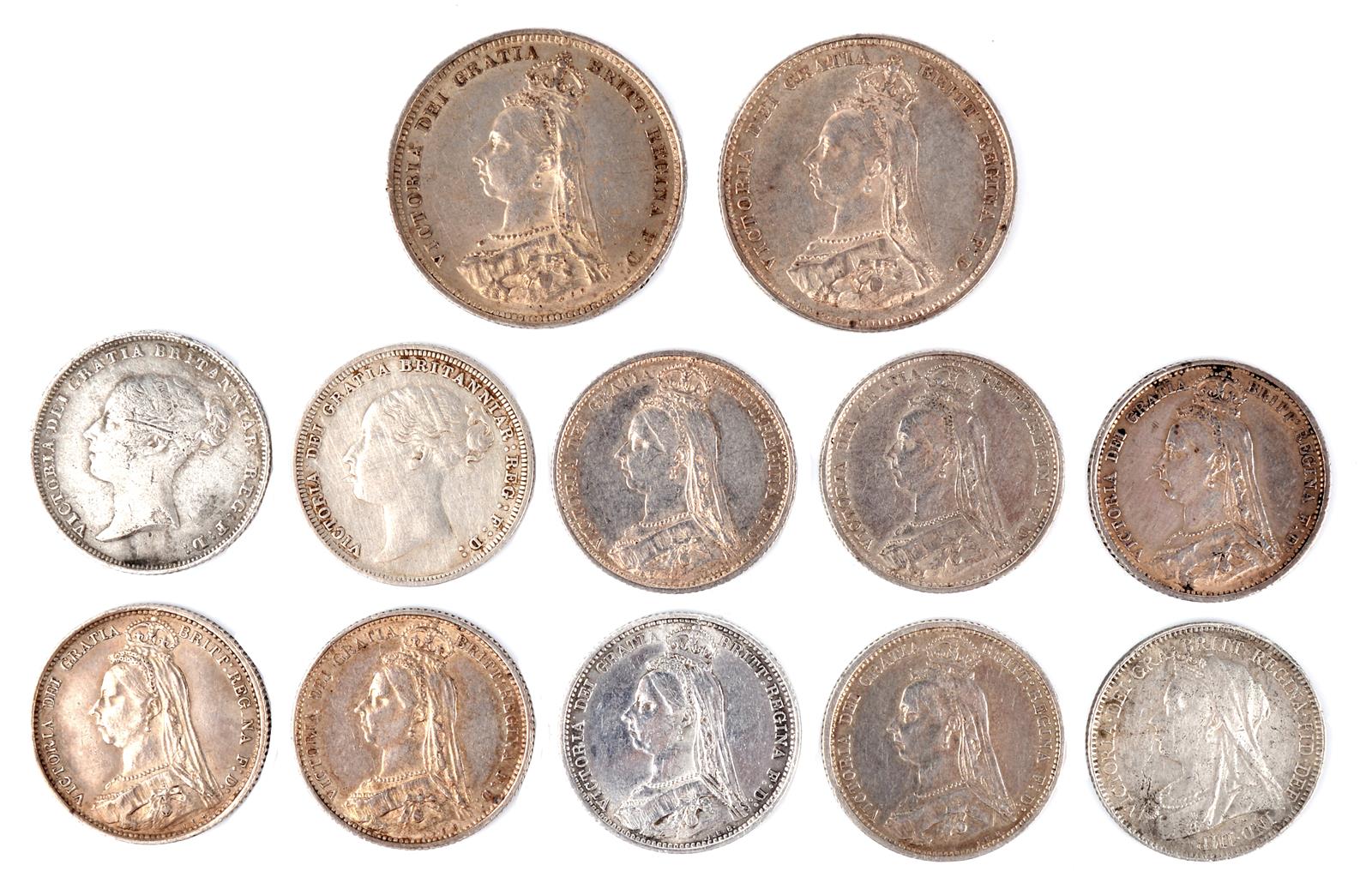 Victoria, Silver Shillings (2), 1887; Sixpences (3), 1841, 1883, 1887 (crowned mark of value); Sixpences (5), 1887, rev. shield in garter 'withdrawn' type; Sixpences (2), 1888, 1898. (S 3926; 3908, 3912, 3928; 3929, 3941). Various grades from very fine to extremely fine. [12]