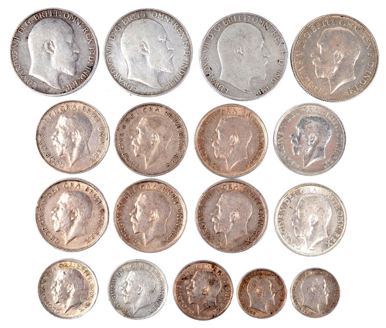 Silver Florins (4), Edward VII, 1902, 1905, 1909 near fine; George V, 1918 good very fine; Shillings (8), George V, 1911, 1914, 1915, 1916 (2), 1917, 1918, 1919 good very fine or better; Sixpences (3) George V, 1916 (2), 1918 nearly extremely fine; Threepences (2), Edward VII, 1902 extremely fine. (S 3981; 4013; 4014; 3984) [17]