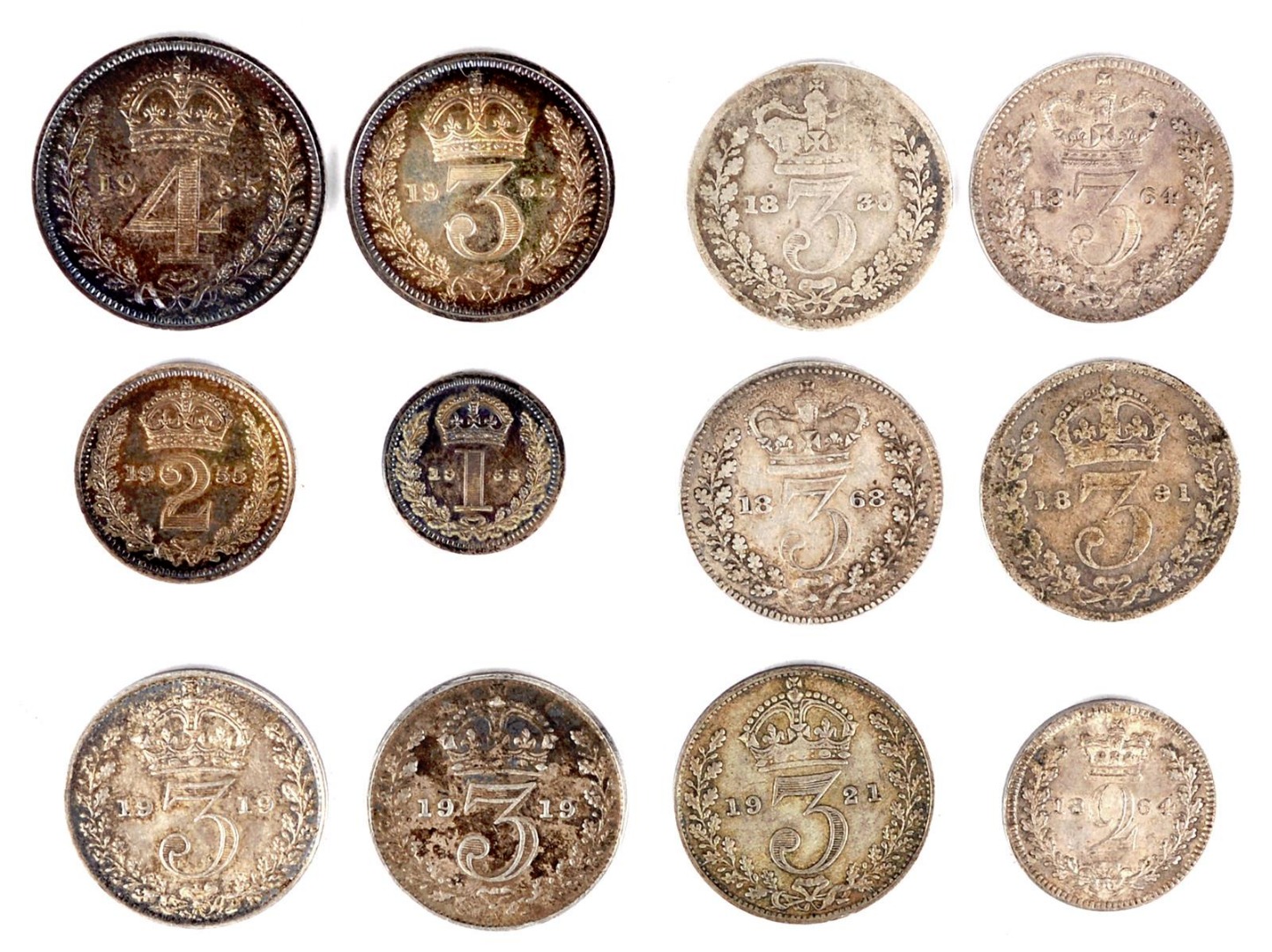 Maundy coins (12), set, Elizabeth II, 1955, uncased, attractively toned and good extremely fine; Threepences (7), George IV, 1835; Victoria, 1864 (very fine), 1868, 1891; George V, 1919 (2 one very fine), 1921; and Maundy Twopence, Victoria, 1864 (very fine). All only fair or fine unless otherwise stated.