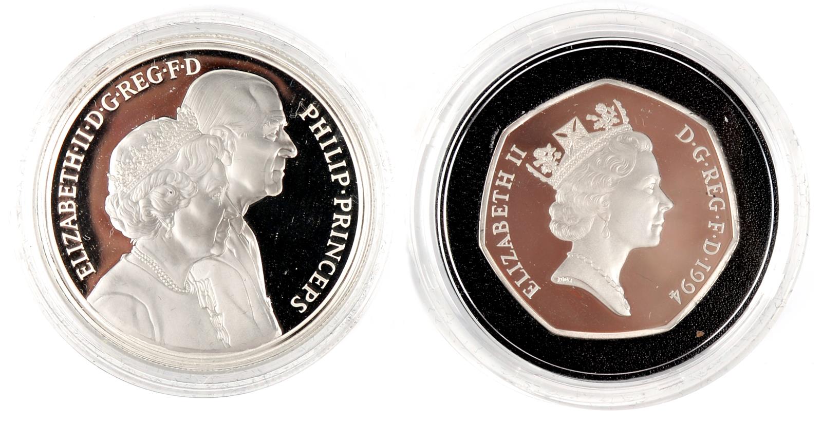 Silver Five Pounds, Elizabeth II, 1997, Golden Jubilee commemorative proof, in case of issue, (S 4304); Silver Fifty Pence, Elizabeth II, 1994, D-Day silver commemorative proof, in case of issue (S 4353); together with a small quantity of commemorative coins and medallions, and sporting medals.