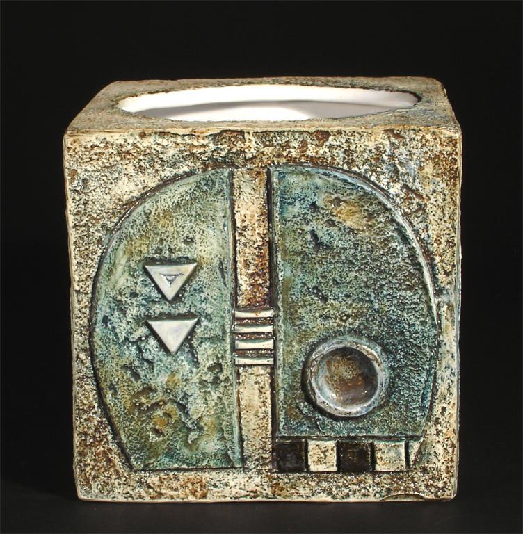 A Troika Pottery large Cube vase modelled in low relief with geometric panels, in shades of blue, green and ochre painted marks, AH monogram 14cm. high