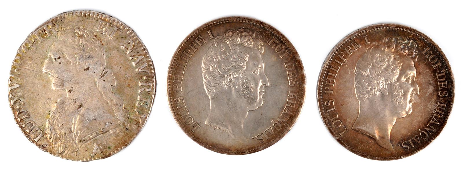 France, Ecu, 1775; 5 Francs (2), 1831. The first fair, the others very fine. [3]