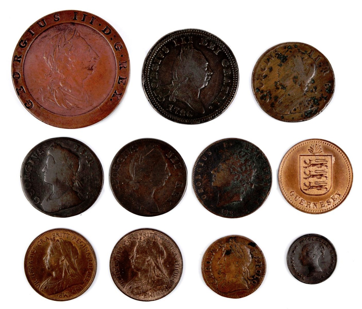 A small collection of copper coins (11), including: Farthing, 1673, near fine; Isle of Man, Penny, 1786, about fine; Twopence, 1797, Soho Mint 'Cartwheel' coinage, good very fine; Guernesey, 4 Doubles, 1949, good extremely fine with lustre; and others in various grades (S 3394; 7413; 3776; 7219) [11]