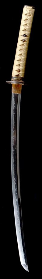 A Japanese sword (wakizashi), blade 22 in., shinogi-zukuri with choji-midare hamon, exhibits utsuri and tobiyaki, unsigned nakago with conjoined ana, copper or shakudo habaki with scratches and raised grains, associated koshirae comprising: iron tsuba with semi-incuse leaf decoration overlaid with flowerheads, fuchi and kashira in shakudo with gilt waterfowl by a stream, plain laquered saya.