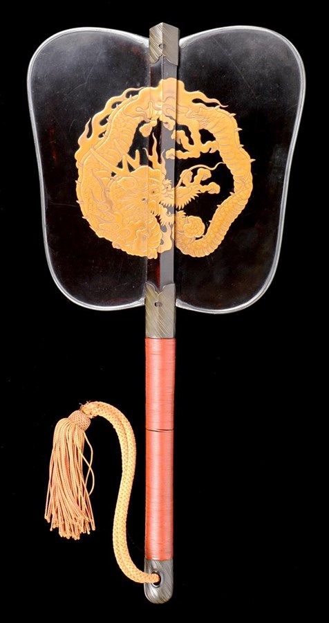 A Japanese war fan (gunbai uchiwa), the metal framed head of butterfly form, decorated in gold lacquer with a dragon to one face against a dark ground, and four seal script characters against a red ground to the other, bronze mounted shaft with lacquered cane bound grip, tasseled cord, 19th Century.