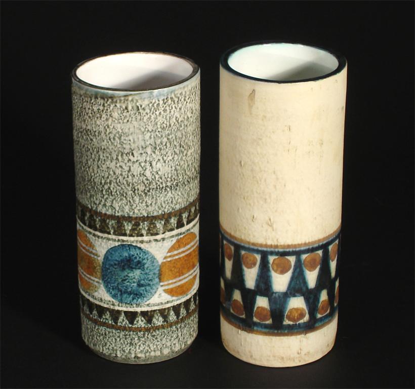 Two Troika Pottery small Cylinder vases painted with geometric bands on blue and buff grounds...