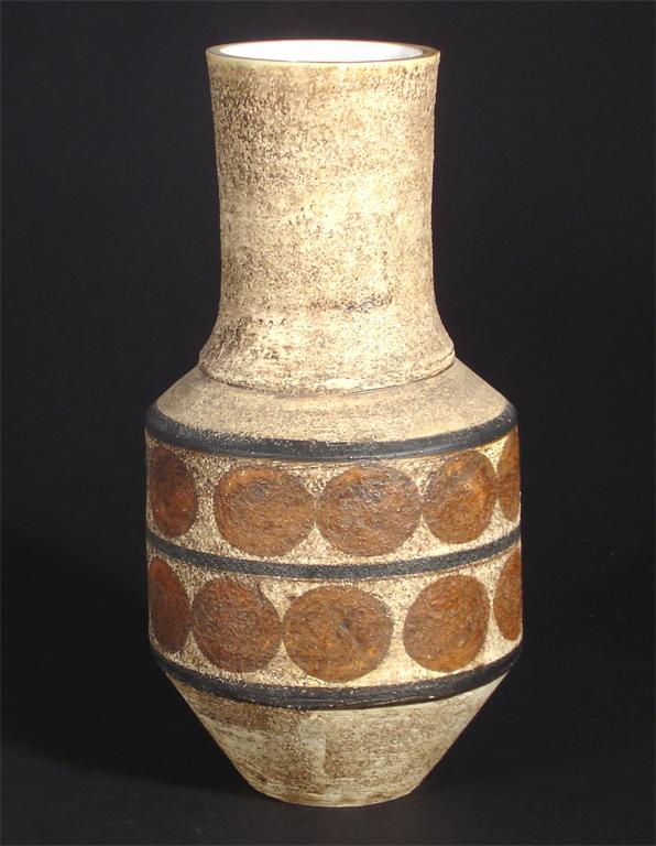 A Troika Pottery Urn vase painted with a band of brown circles painted marks, ND artist monogram 25.5cm. high