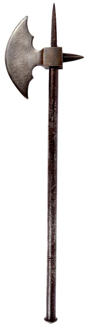 An Indo Persian steel axe, haft engraved with a spiral band of foliate scrolls, later crescent shaped head with large square socket and spiked peen.