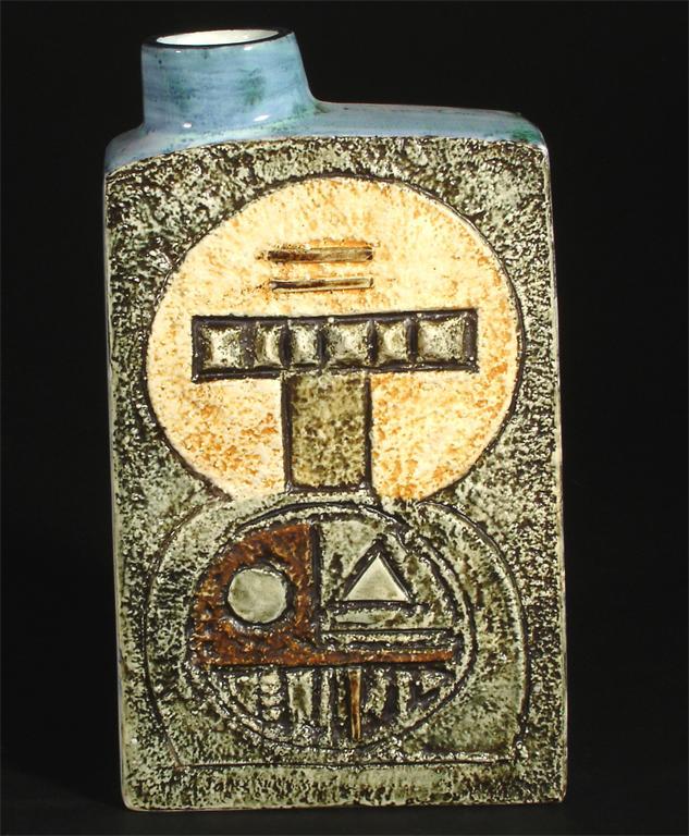 A Troika Pottery Chimney vase modelled in low relief with stylised figure, in shades of green and ochre with a blue shoulder painted marks, artist cypher 20.5cm. high