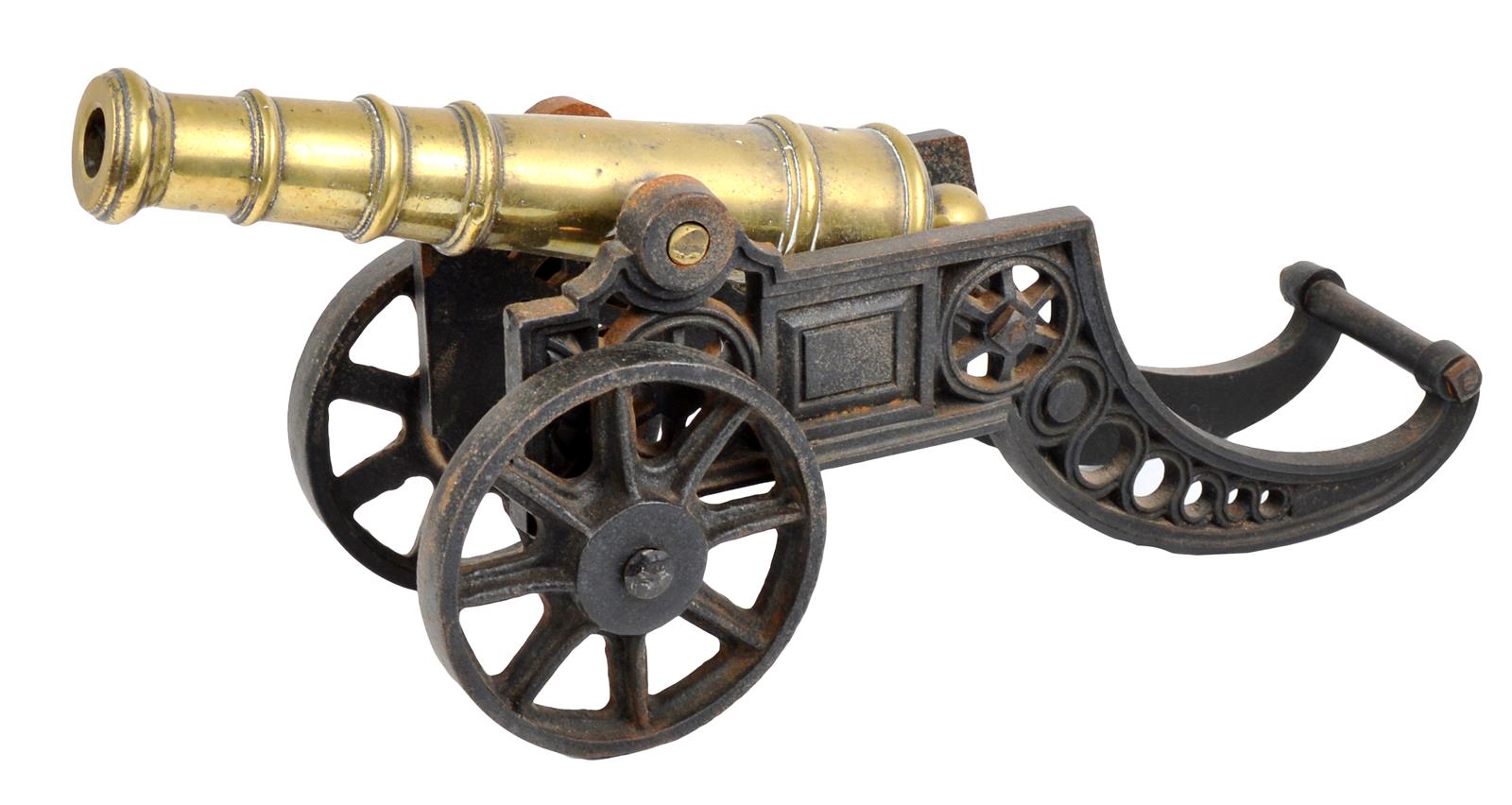 A 19th Century model cannon, brass barrel 11.5 in. including cascobel, cast iron carriage with spoked wheels and openwork decoration, touch hole not patent.