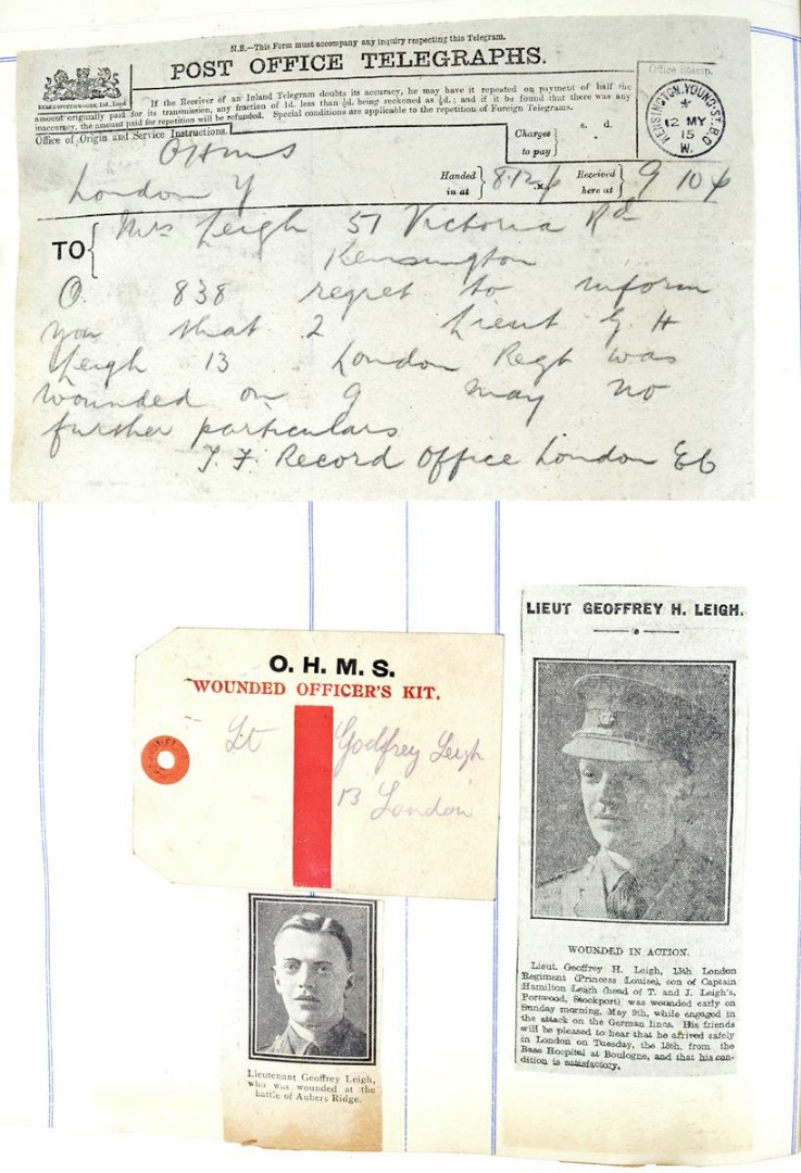 An album of Great War era cuttings, containing much material relating to Lieutenant Geoffrey Hamilton Leigh of the 13th (First Reserve) Princes Louise's Kensington Battalion (The London Regiment), including: telegrams from this man as he was about to be posted to the Continent (3rd November 1914), cuttings from the Kensington Times describing the progress of the war and conditions at the front, a further Telegram informing Mrs Leigh of her son being wounded (at the Battle of Aubers Ridge, May 9th 1915), further correspondence relating to a second wounding, and latterly to his return home in 1916, concluding with a cutting from the Times announcing his marriage in January 1920.