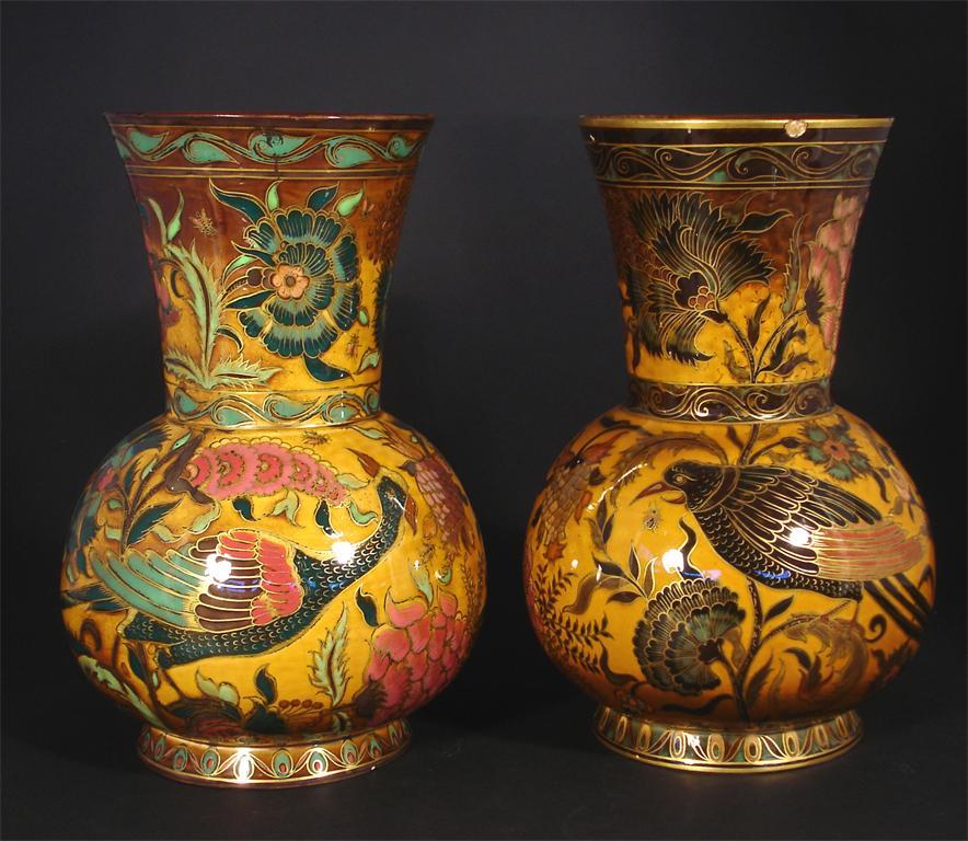 A pair of Zsolnay Pecs vases printed and painted in colours and gilt on a mustard ground, with birds amongst foliage impressed and printed marks, chips 31cm. high