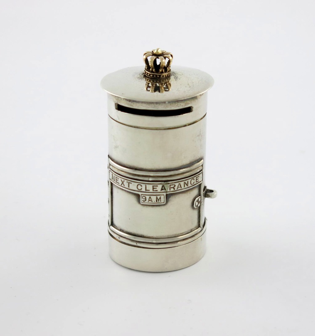 modelled as a pillar letter box, the pull-off cover with a gilded crown finial, pull-off base, the front inscribed 'Next Clearance 9am', height 6.5cm, approx. weight 1.4oz.