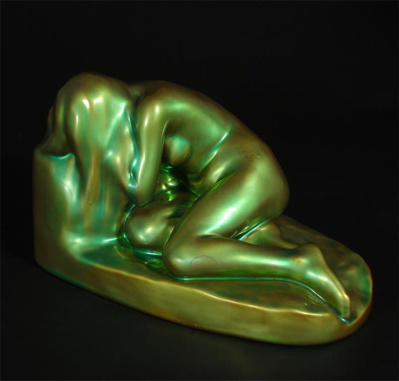 A Zsolnay Pecs figure of a maiden covered in a green lustre glaze printed gilt mark 23.5cm. wide