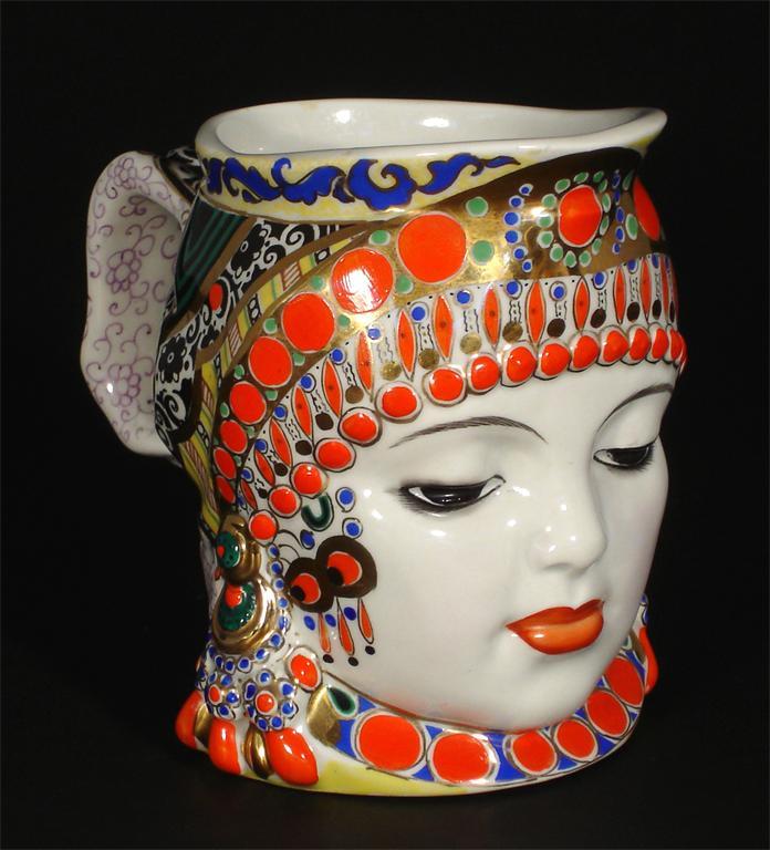 A Lomonosov, Russian pottery mug modelled as a woman in national costume, in colours and gilt printed marks 14cm. high