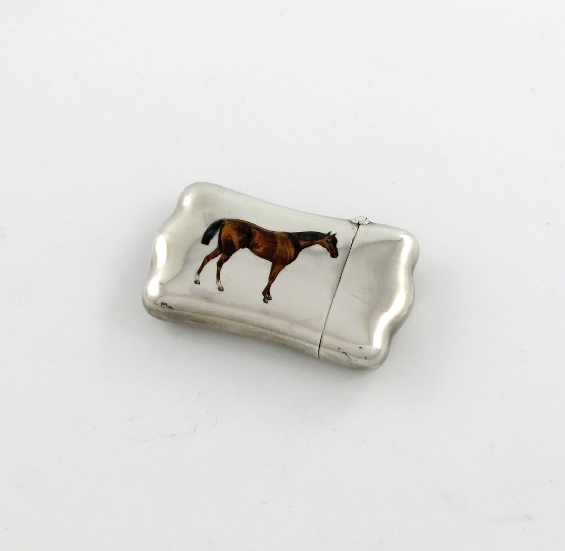 shaped rectangular form, enamelled with a standing race horse, length 6.5cm, approx. weight 1.2oz.