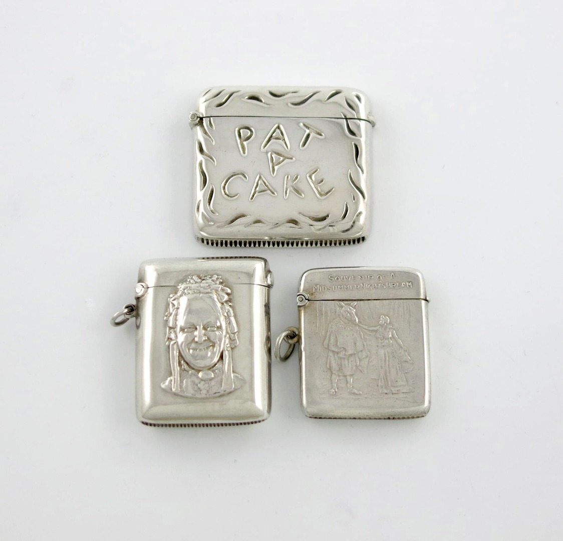 comprising: one embossed 'PAT A CAKE', by H. Cooper and Co, Birmingham 1927, one embossed with Charley's Aunt, by Walker and Hall, Sheffield 1909, and one with a scene from A Mid Summer Night's Dream, by the Goldsmiths and Silversmiths Company, London 1905, approx. total weight 2.4oz. (3)