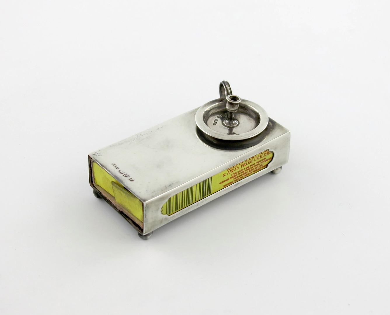 rectangular form, the cover mounted with a miniature chamber stick, on four ball feet, length 8cm, approx. weight 1.5oz.