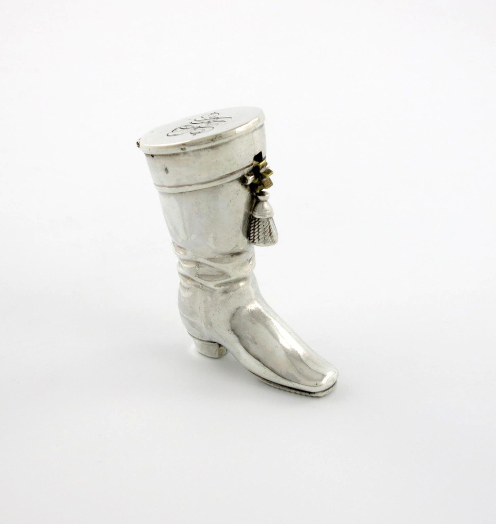 modelled as a boot, the hinged cover initialled, the interior with a lighting cord holder, the interior with a turning star tassel mount, the underside of the sole with a striker, height 5.8cm, approx. weight 0.8oz.