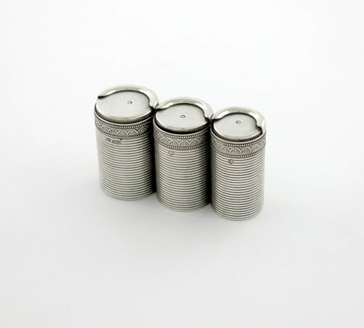 cylindrical form, reeded decoration, foliate borders, spring action holders, length 6.5cm, approx. weight 1.8oz