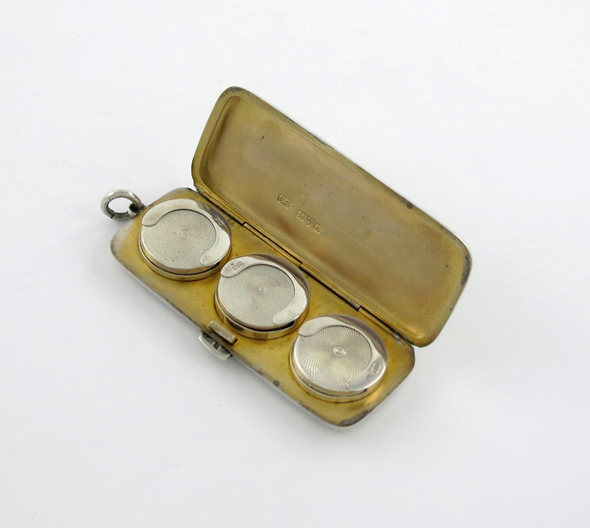 rectangular form, engine-turned decoration, with a ring attachment, initialled, length 8.5cm, approx. weight 1.6oz.