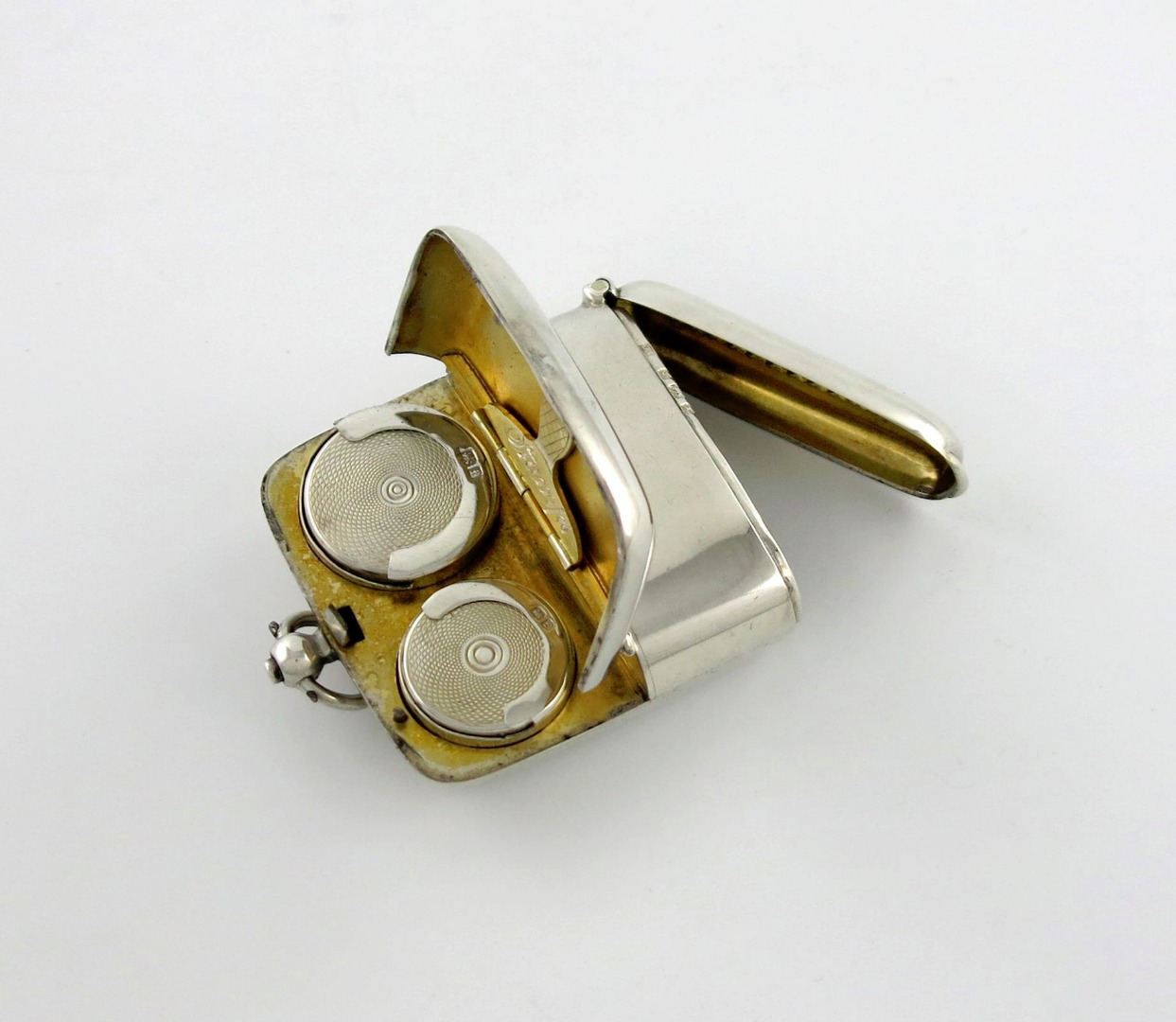 rectangular form, hinged covers, designed to fit a sovereign and a half sovereign, the interior of the cover with a sprung clip, with a ring attachment, length 6.4cm, approx. weight 2.2oz.