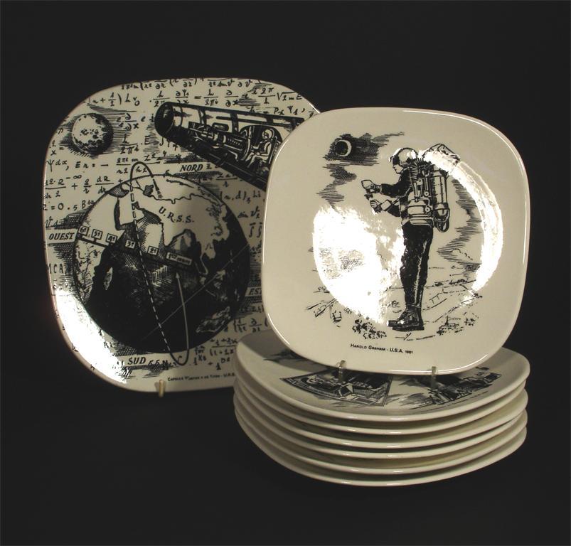 An interesting Gien Space Travel sandwich set printed in black with space and aeronautical...