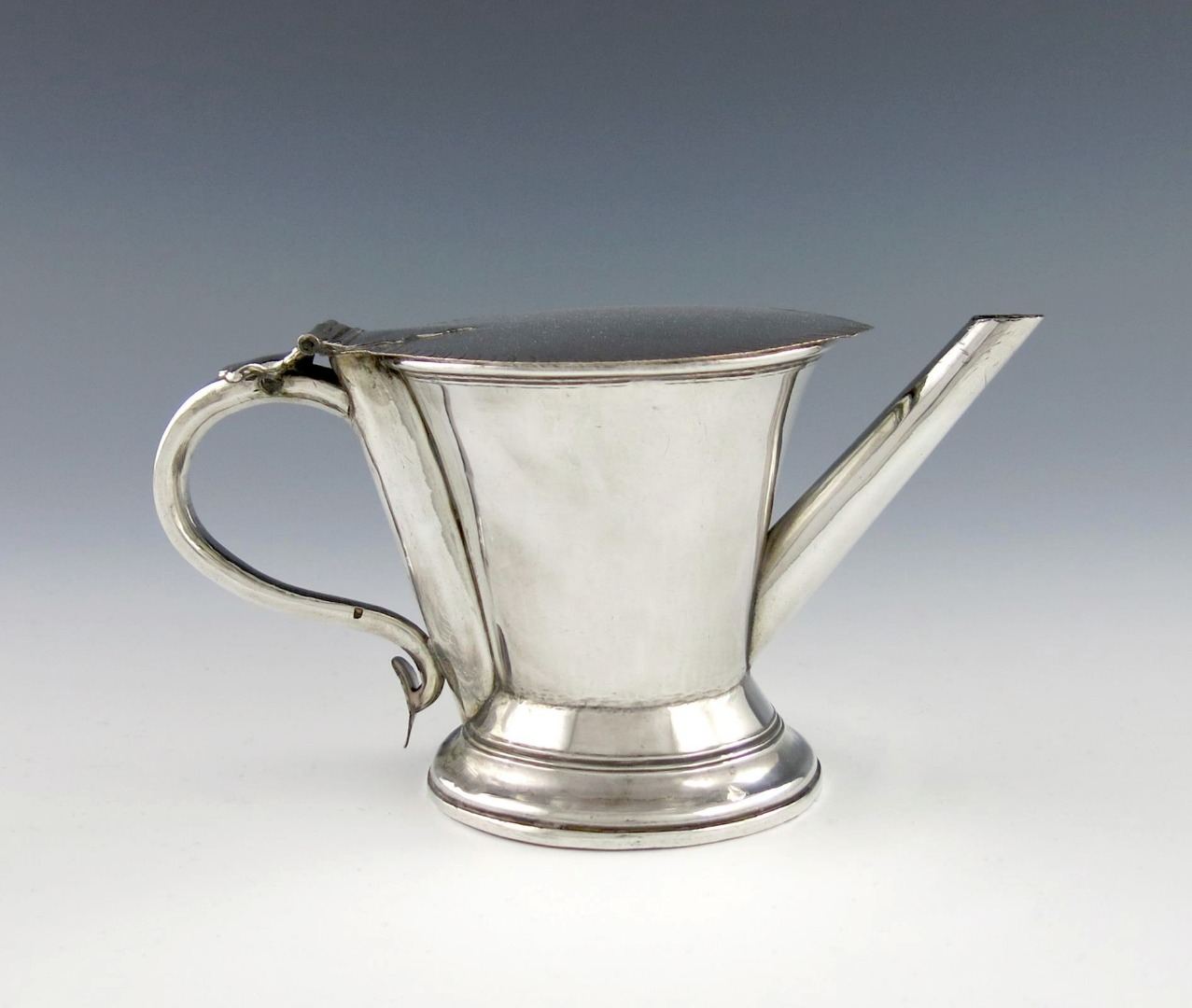 unmarked circa 1765-70, tapering circular form, the scroll handle with a heart-shaped cartouche, the hinged cover with a feather-edge border, internal hot-water compartment, on a circular base, height 9.8cm.