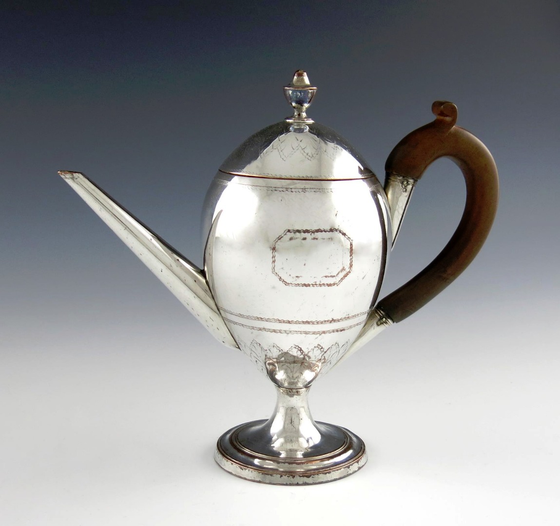 ovoid form, straight tapering spout, scroll handle, engraved decoration, the pull-off cover with an urn finial, the interior with a heating compartment with a cover, on a circular foot, height 18cm.
