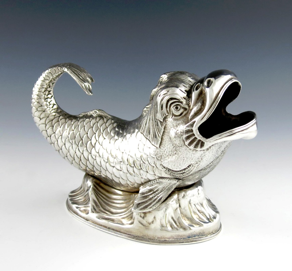 modelled as a mythical dolphin, on a raised oval foot, length 21.5cm, height 14.5cm.