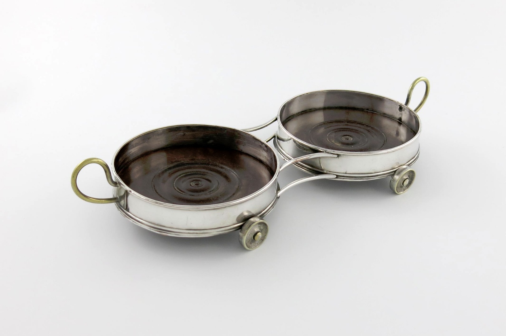 double plain circular form, scroll handles, on four wheels, length 34.5cm.