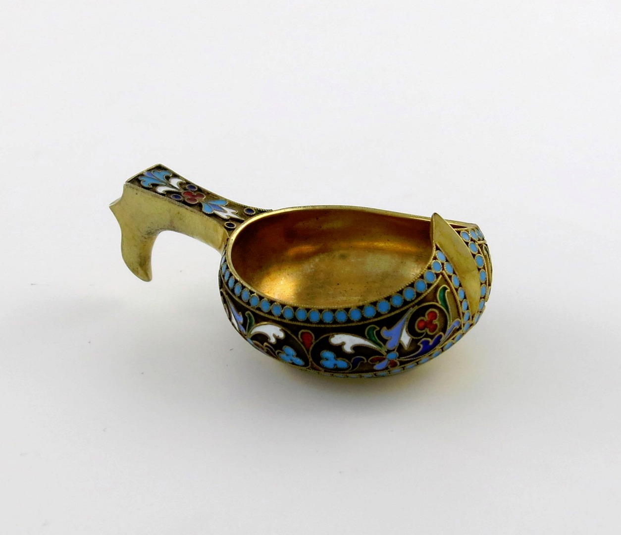 oval form, with vari-coloured foliate scroll decoration, on a matted background with rope-work borders, enamelled blue bead border, length 8cm, approx. weight 1.4oz.