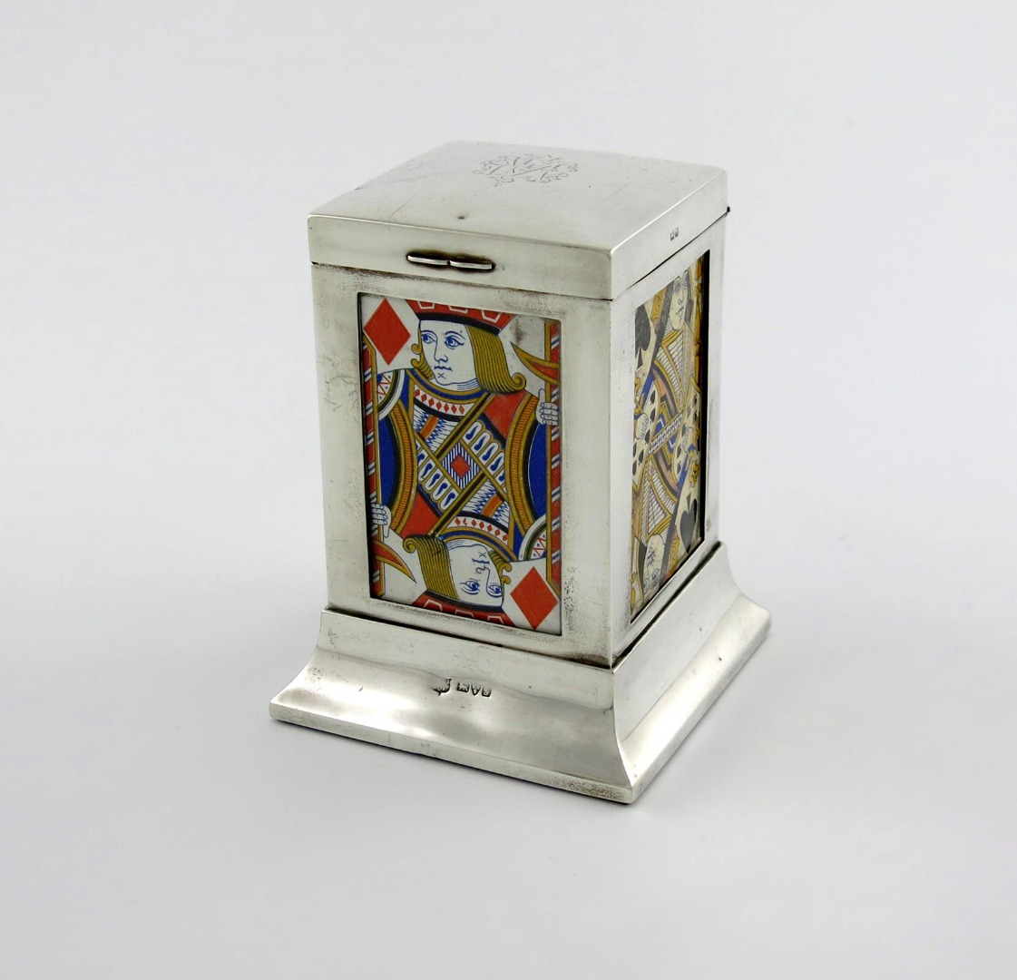 upright rectangular form, the hinged cover with a monogram, the sets set with playing cards, one under glass, on a spread square base, height 13cm.