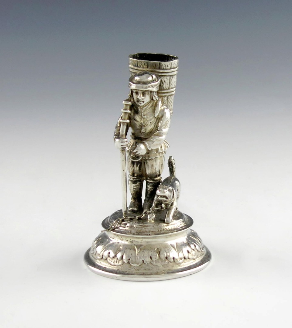 modelled as a standing man with a basket on his back, with a staff and a dog at his feet, on a raised circular foot, height 8.8cm, approx. weight 3oz.