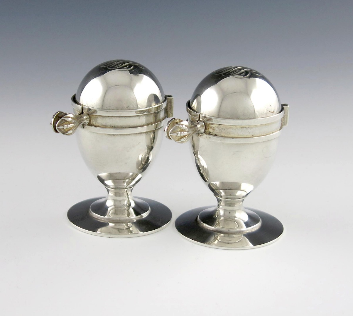 A pair of American silver egg cups with cutting hinged covers