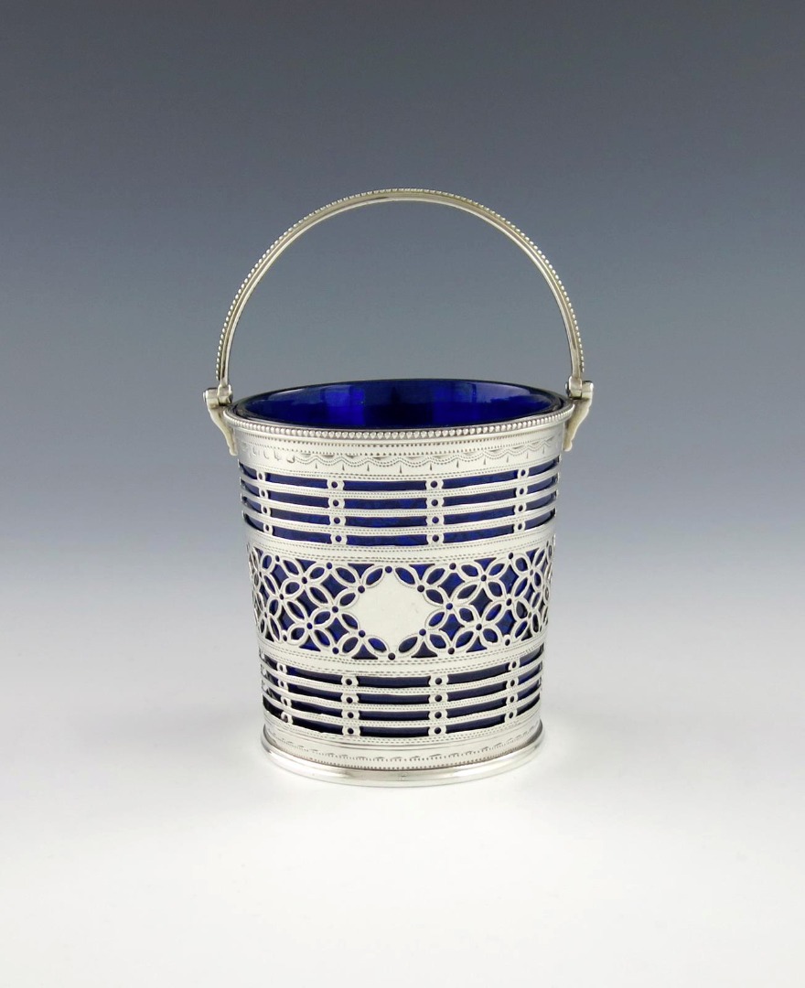 tapering circular form, pierced with horizontal slats and foliate motifs, engraved bands of decoration, beaded borders, and swing-handle, with a blue glass liner, height 8.5cm, approx. weight 3.3oz.