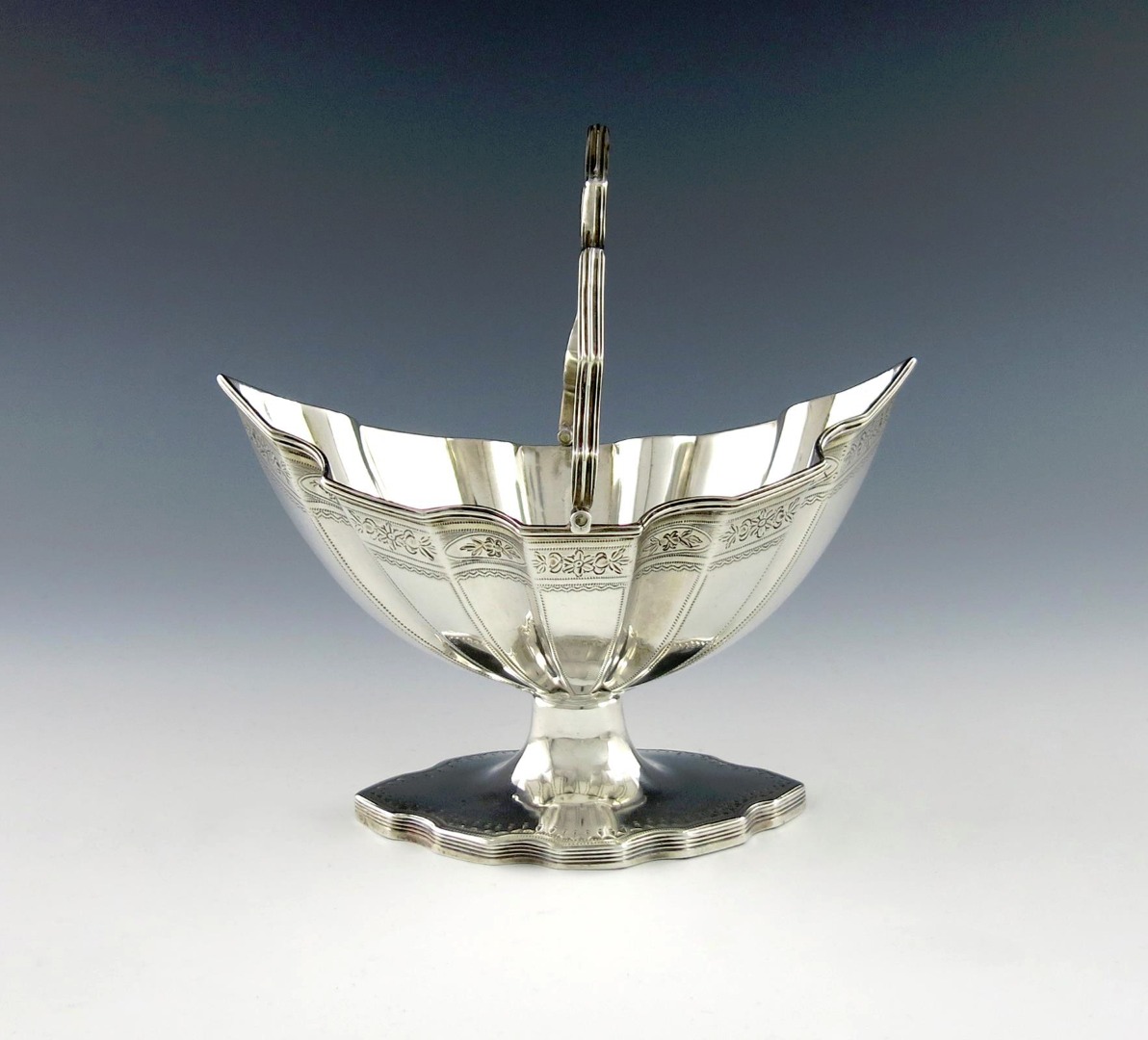 shaped oval form, bright-cut decoration, swing-handle, on a shaped oval foot, length 17.8cm, approx. weight 7.8oz.