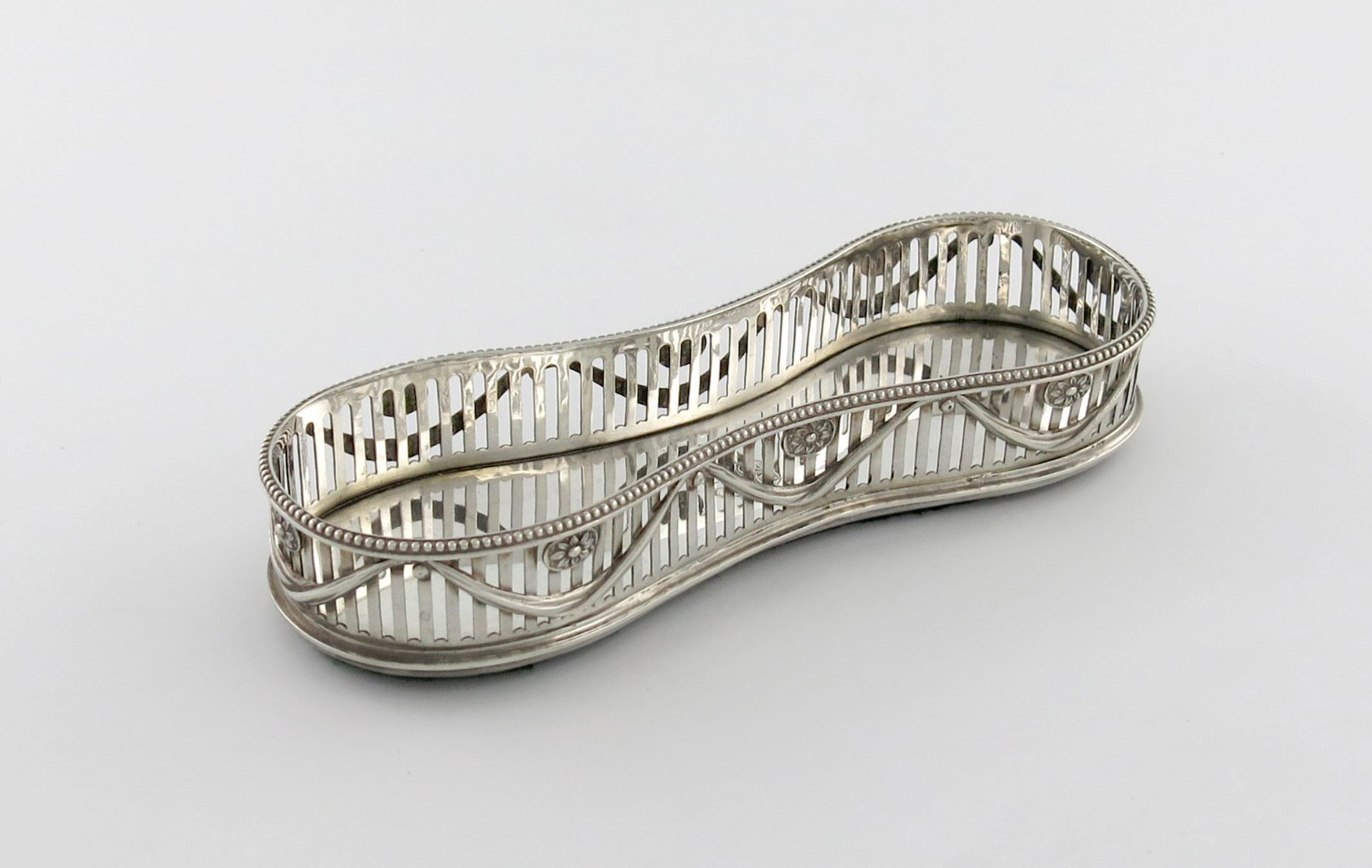 shaped oblong form, with a pierced gallery with oval medallions and drapes, beaded border, engraved with a monogram, wooden base, length 19.7cm.