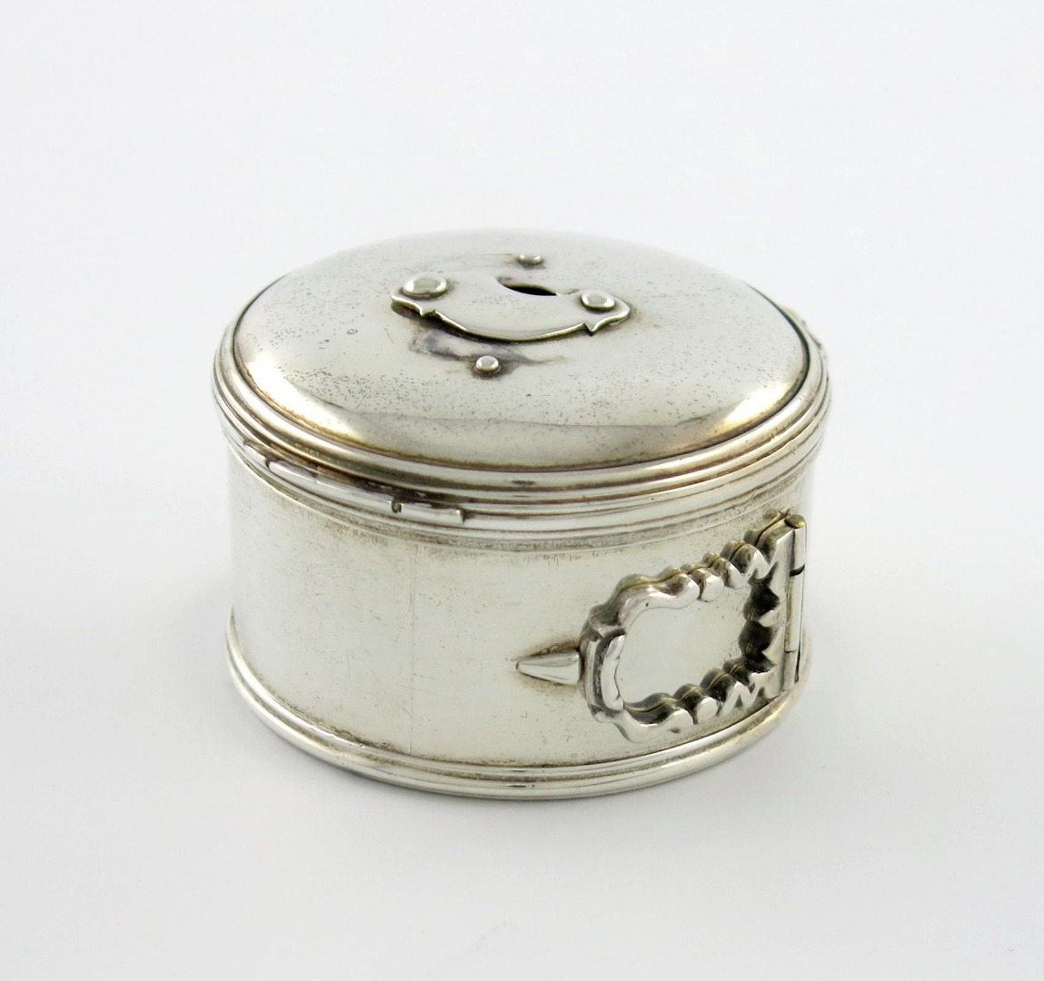 circular form, the side with a hinged handle, the domed hinged cover with a cutter, diameter 5cm, approx. weight 1.5oz.