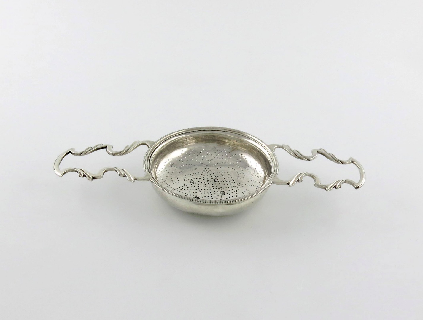 circular form, with scroll side handles, the circular bowl with pierced decoration, rope-work border, length 23.7cm, approx. weight 3.3oz.