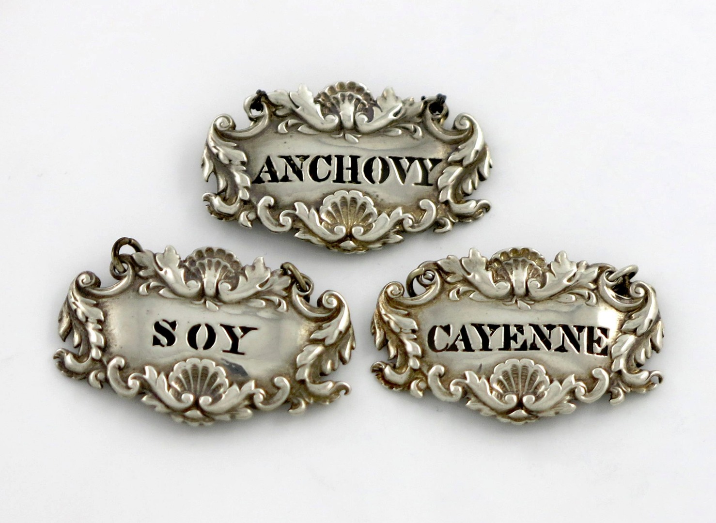 shaped oval form, foliate scroll borders, pierced 'ANCHOVY', 'CAYENNE', and 'SOY', length 3.4cm, approx. weight 0.4oz. (3)