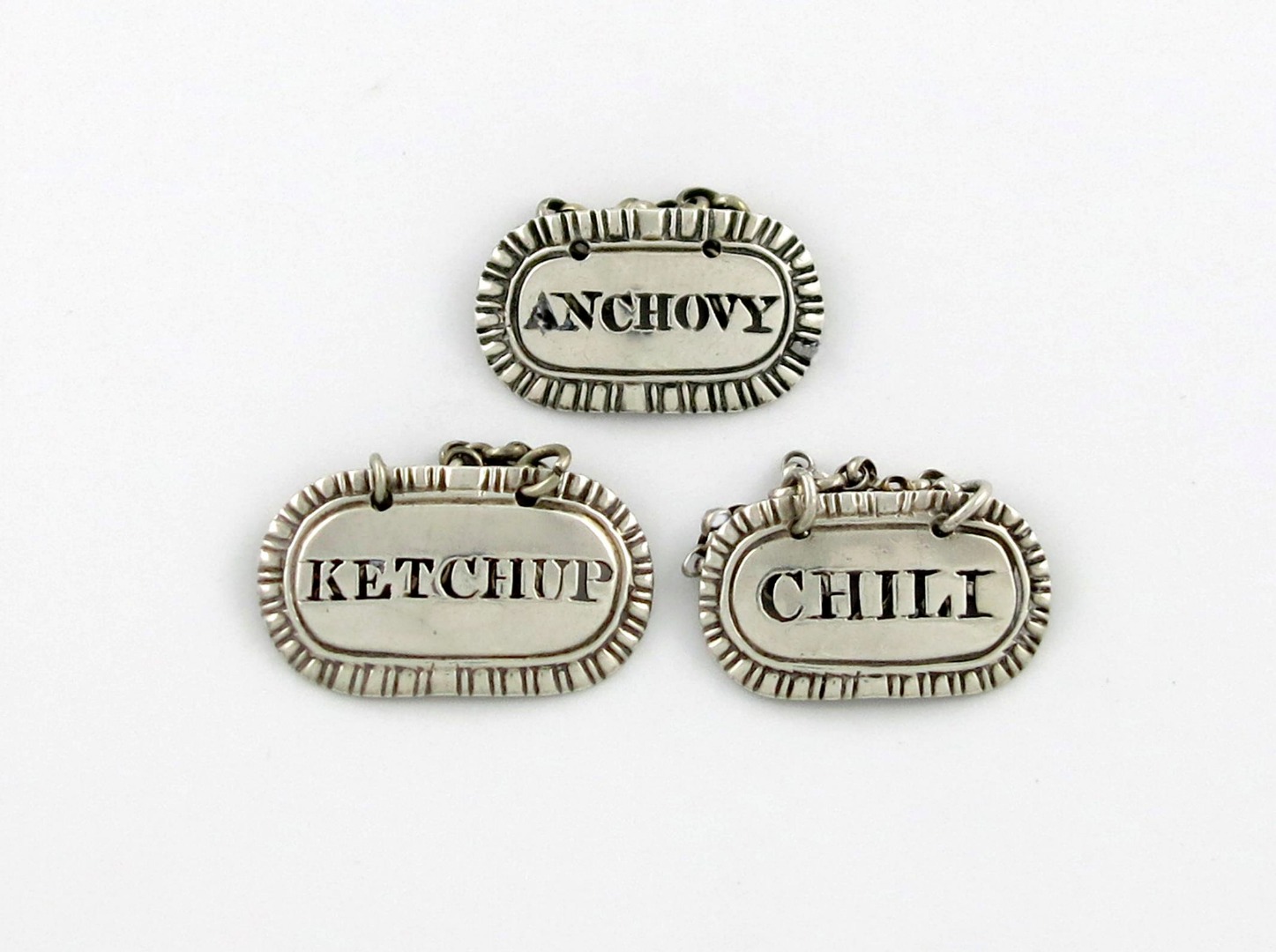 oblong form, gadroon border, pierced 'ANCHOVY', 'KETCHUP', and 'CHILI', approx. weight 0.20z. (3)