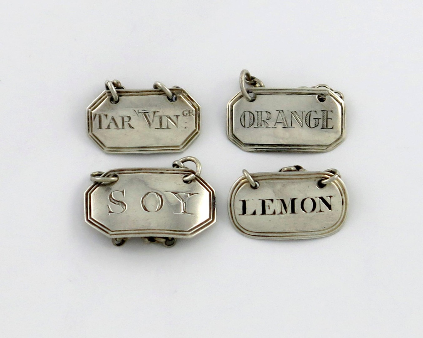 canted rectangular and oblong form, reeded border, comprising: 'TARn.VINgr', by George Knight, London 1818, one 'ORANGE', London 1805, plus 'SOY' and 'LEMON', approx. weight 0.4oz. (4)