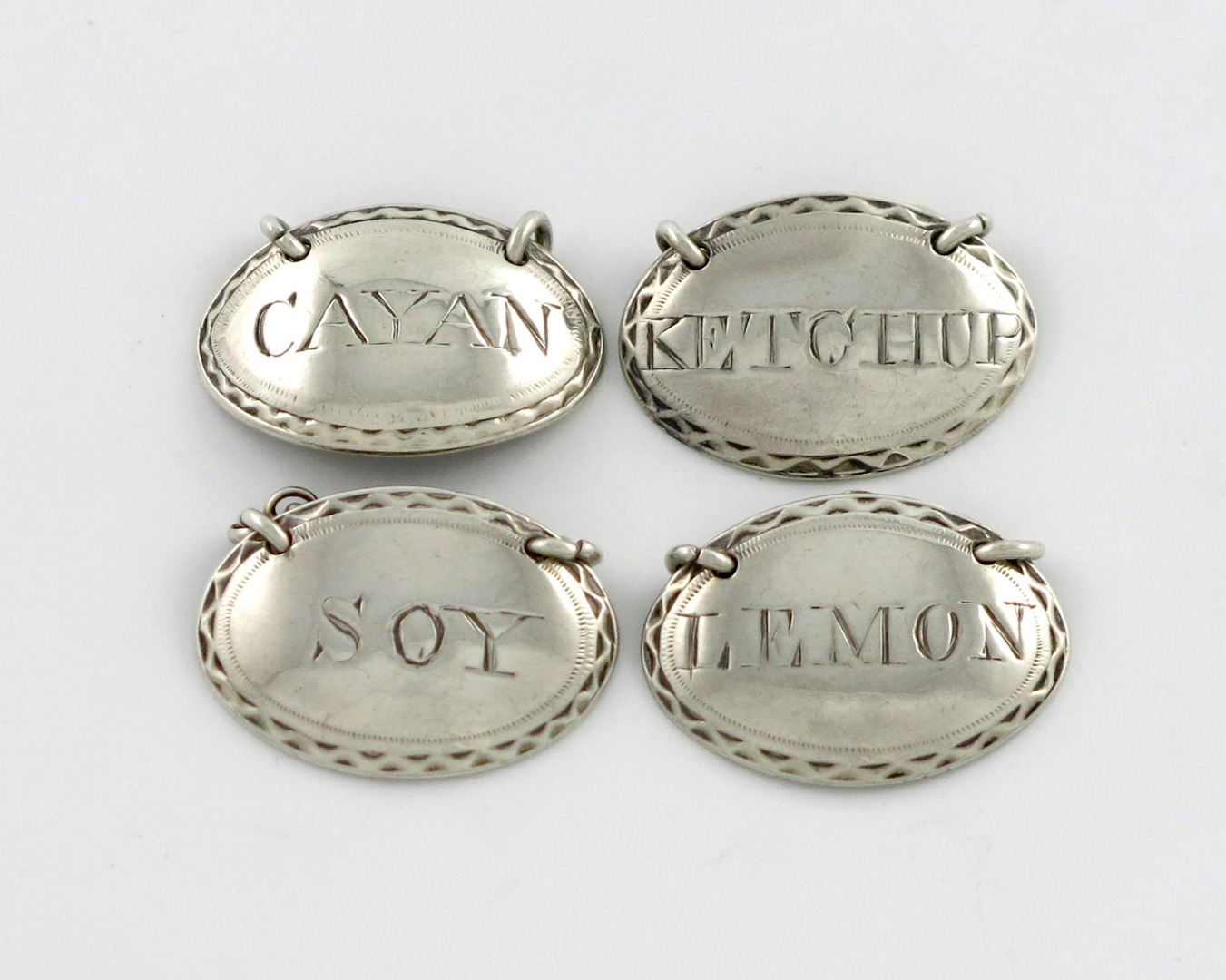 oval form, bright-cut borders, incised 'KETCHUP', 'SOY', 'LEMON' and 'CAYAN', length 2.5cm, approx. weight 0.4oz. (4)