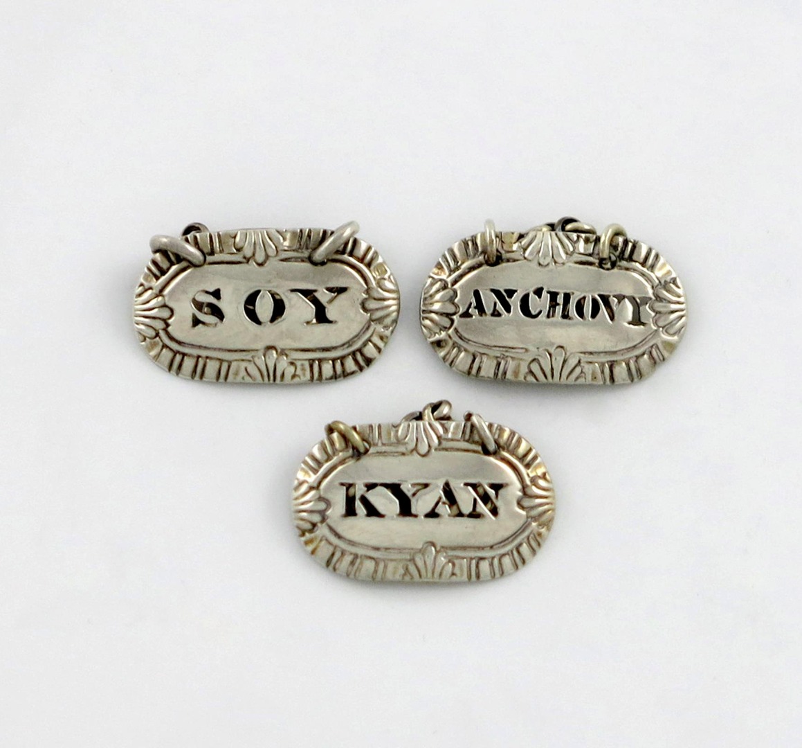 oblong form, gadroon and shell border, pierced 'KYAN', 'SOY' and 'ANCHOVY', length 2.2cm, approx. weight 0.25oz. (3)