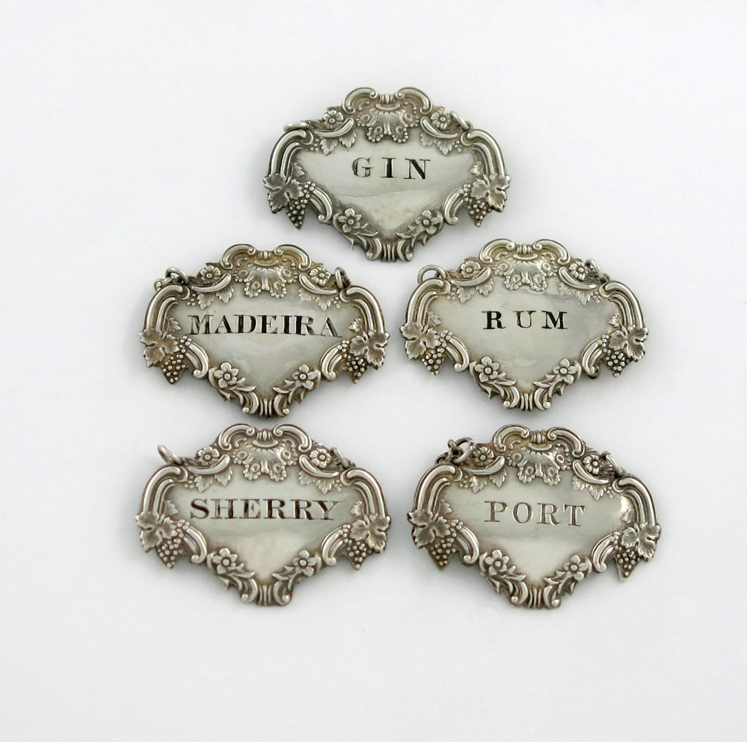 shaped oval form, scroll and vine borders, incised and blackened 'MADEIRA', 'GIN', 'RUM', 'SHERRY' and 'PORT', length 4.4cm, approx. weight 1.4oz. (5)