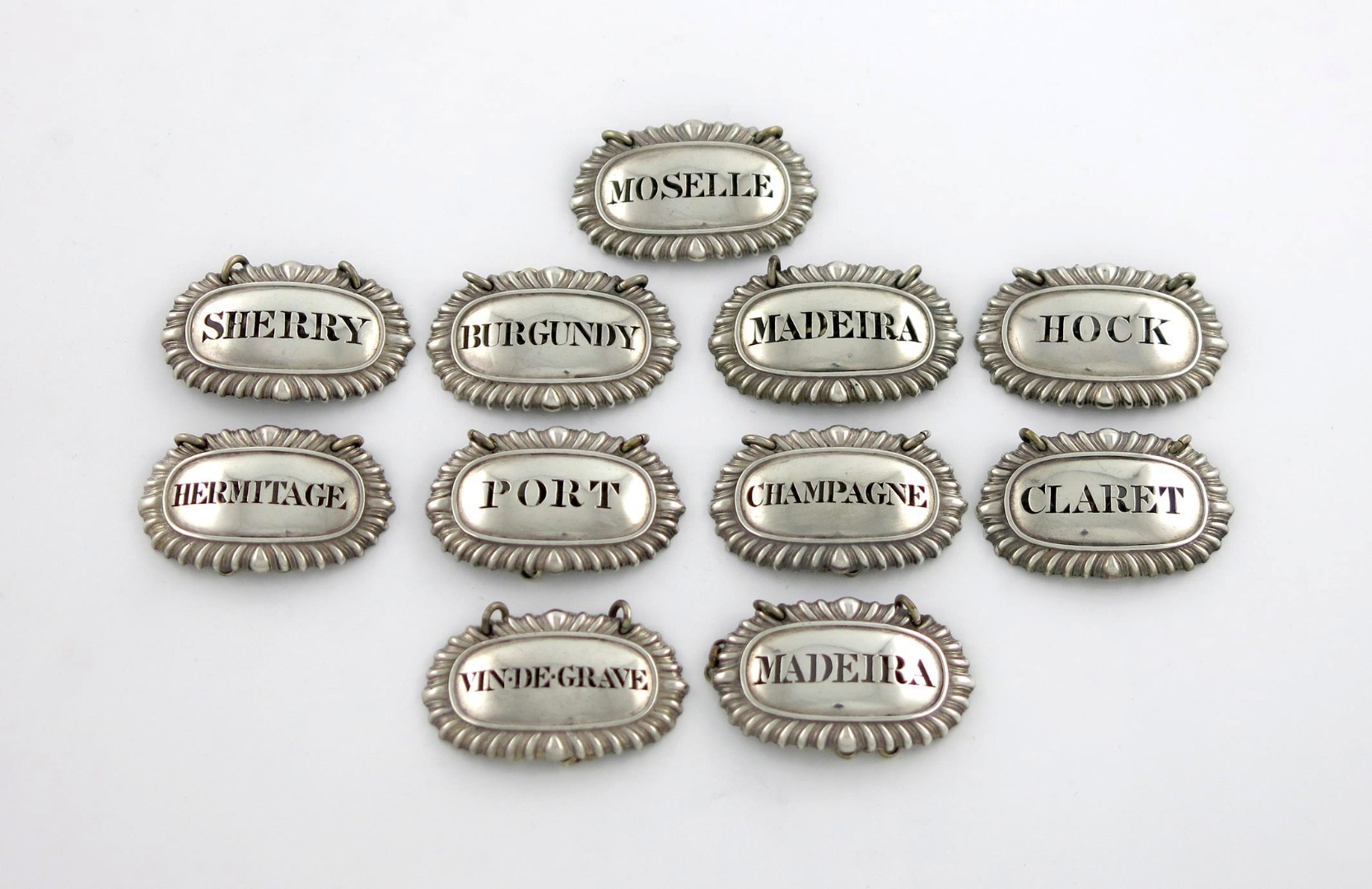 oval form, gadroon border, pierced 'HERMITAGE', 'MADEIRA' (x2), 'MOSELLE', 'CLARET', 'BURGUNDY' 'VIN.DE.GRAVE', 'HOCK', 'CHAMPAGNE', 'SHERRY' and 'PORT', length 5.3cm, approx. weight 7.3oz. (11)