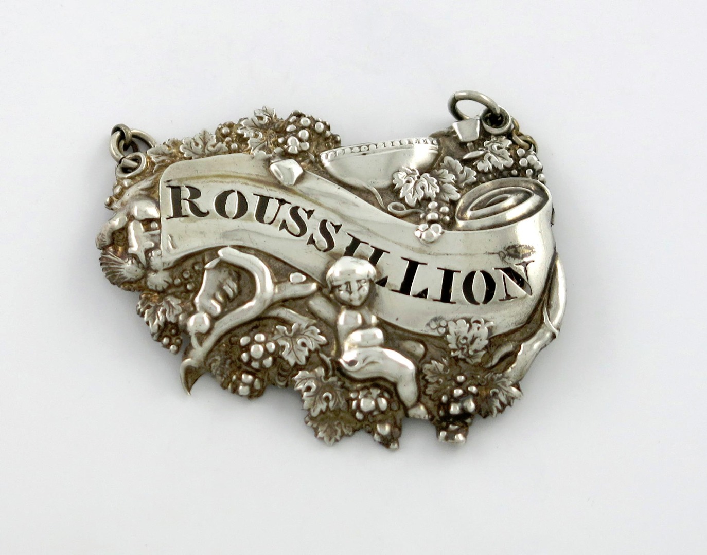 shaped form, with a Bacchanalian cherub, a leopard head, urn and trailing grape vines, pierced 'ROUSSILLION', length 6.2cm, approx. weight 0.6oz.